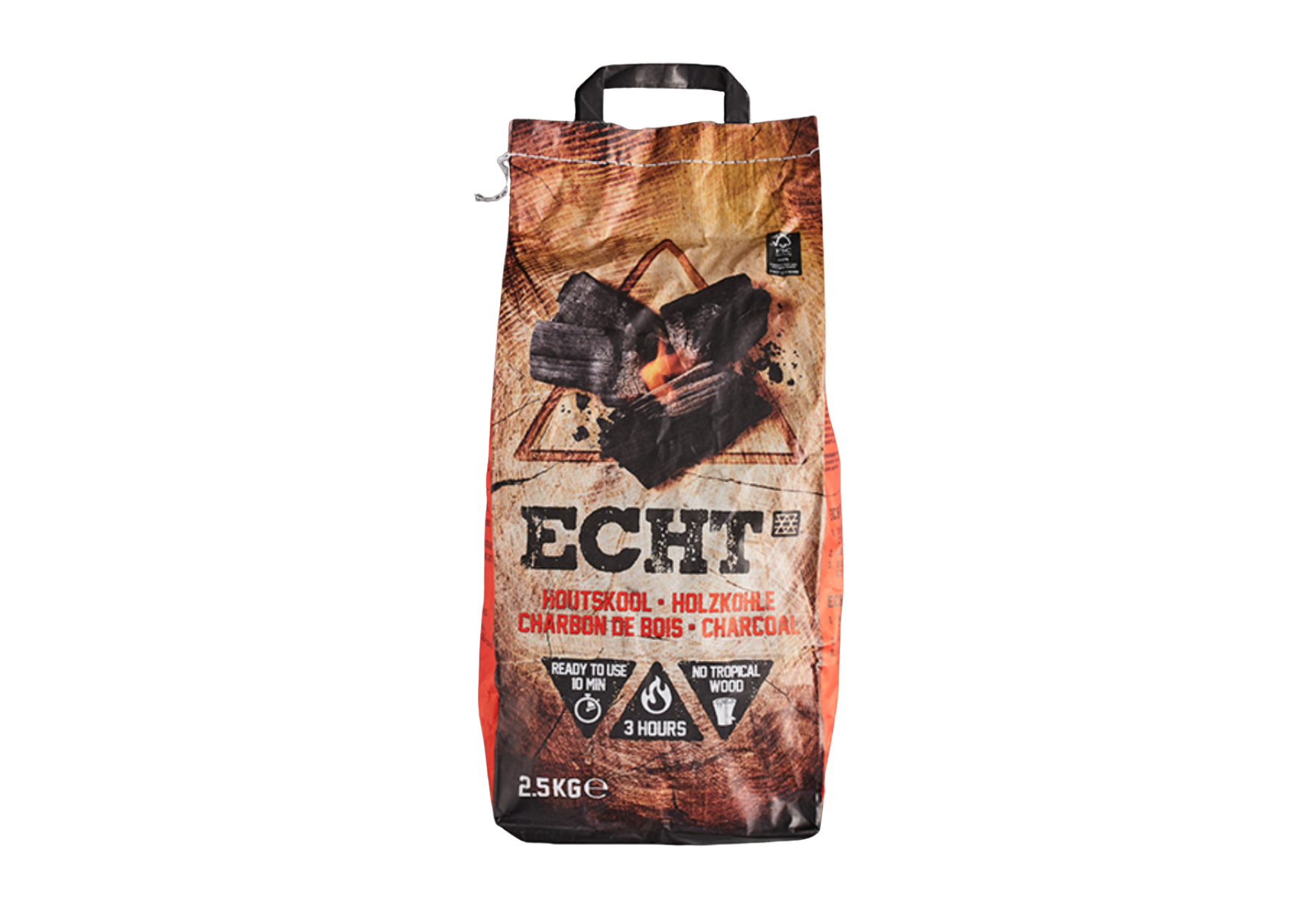 ECHT® Houtskool 2.5kg ideaal voor een keer bbq-en. Het is gegarandeerd gemaakt van ècht hout uit FSC® gecertificeerde bossen. Door het hoge gehalte aan zuivere koolstof, vrij van verontreinigingen, grill je het vlees beter èn is de barbecue binnen 10 minuten heet. Voor een ECHT® lekkere BBQ en altijd het beste resultaat!
